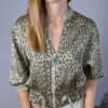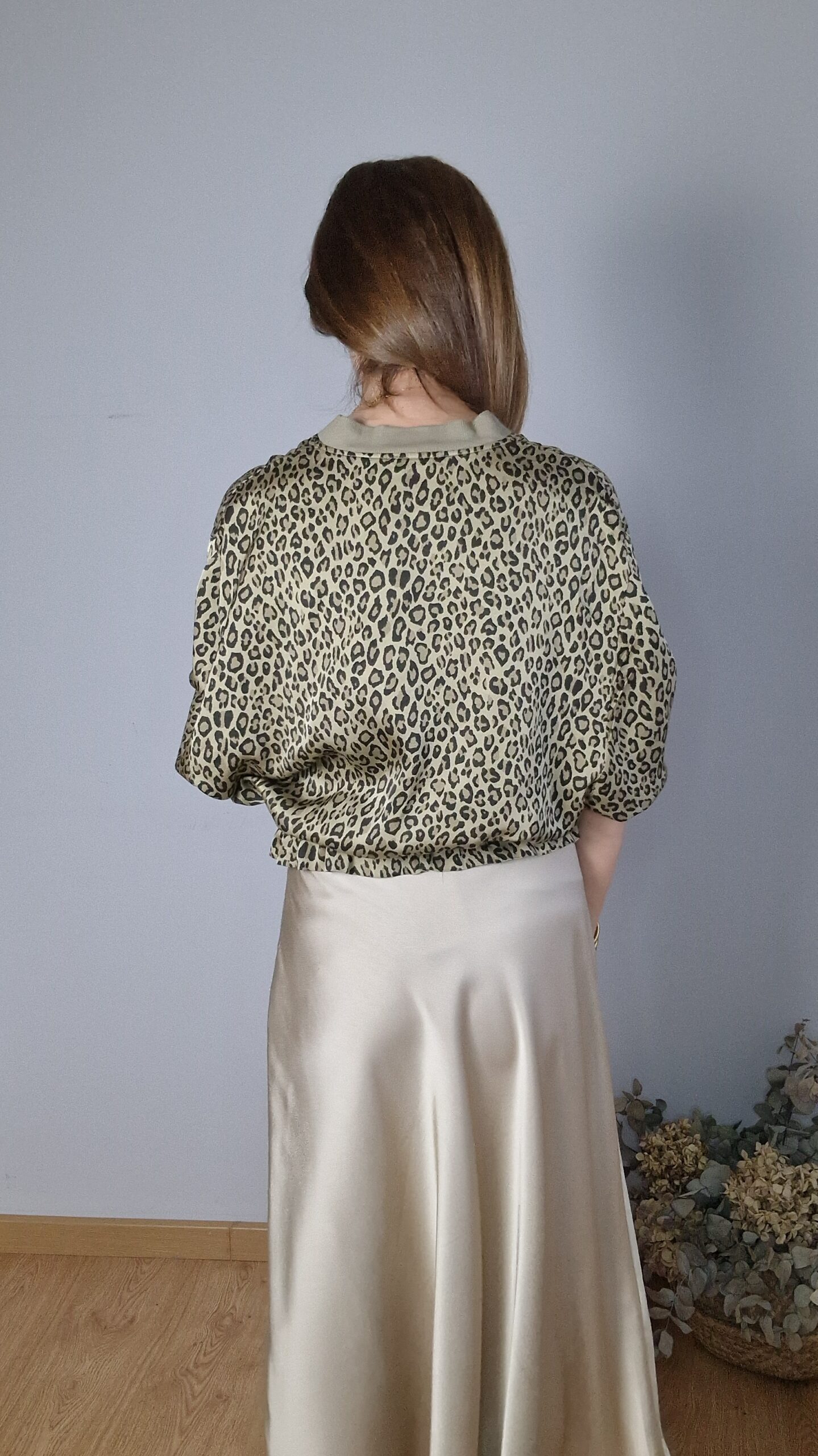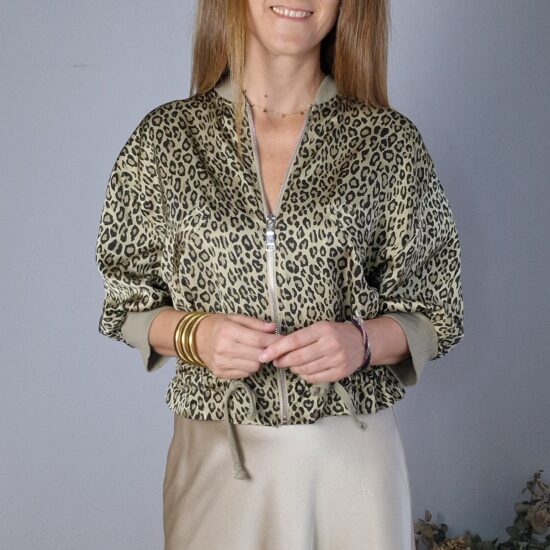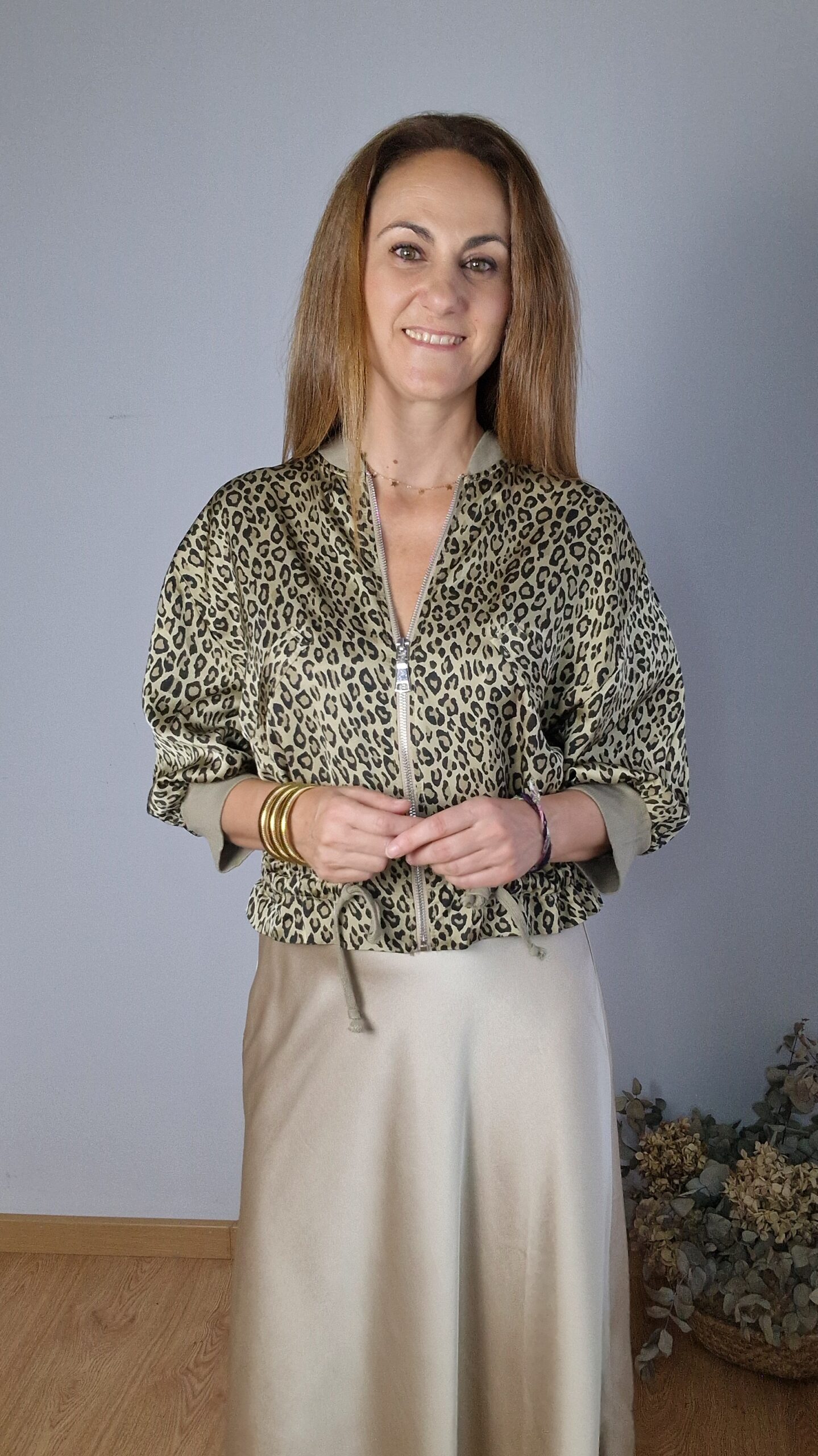 Bomber satinada, cierre cremallera central, semi manga con puño de punto, lazada ajustable en la parte de abajo.