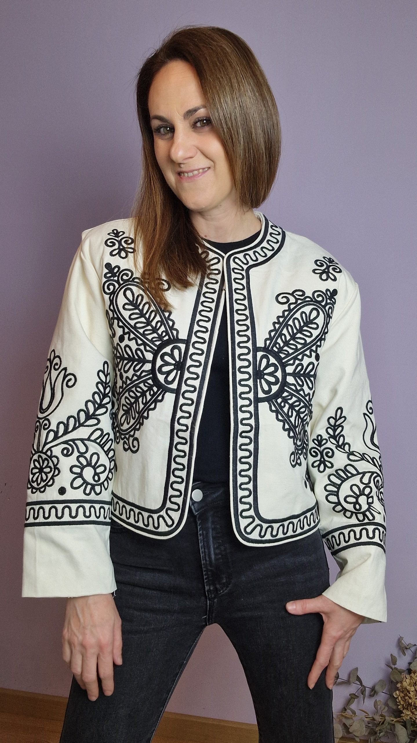 Esta chaqueta de algodón destaca por su diseño de bordados en negro que aportan un toque de elegancia y especial a cualquier look. Cuenta con un corchete en la parte superior como cierre frontal que le da un aire sofisticado. Interior acorchado y bolsillos laterales lo que hace que sea un complemento indispensable para esta primavera. Chaqueta ideal tanto para looks formales como para estilismos mas casuales.