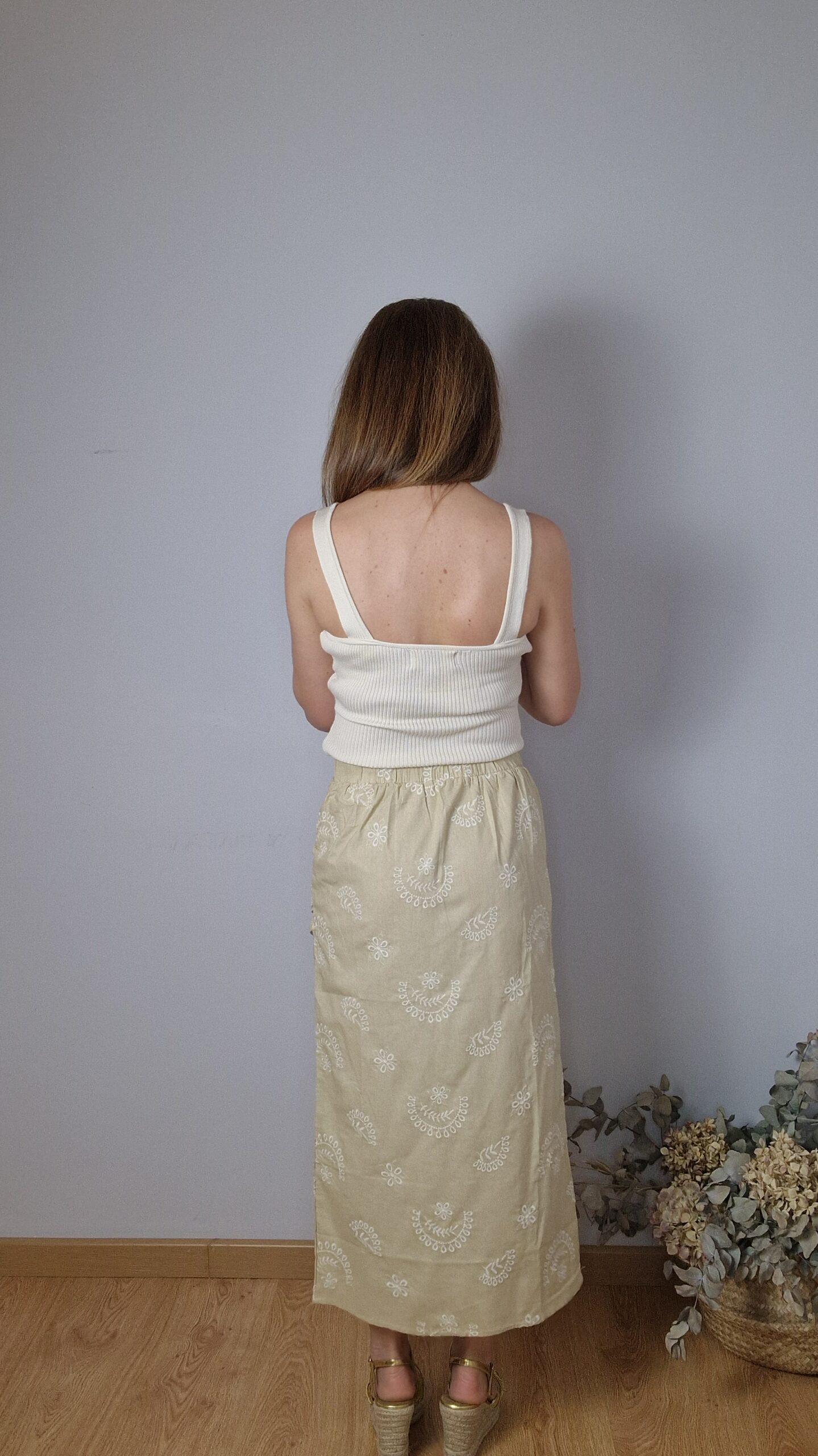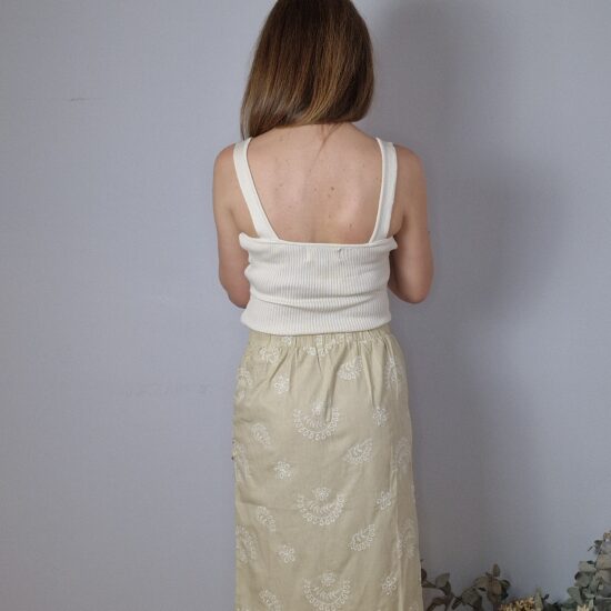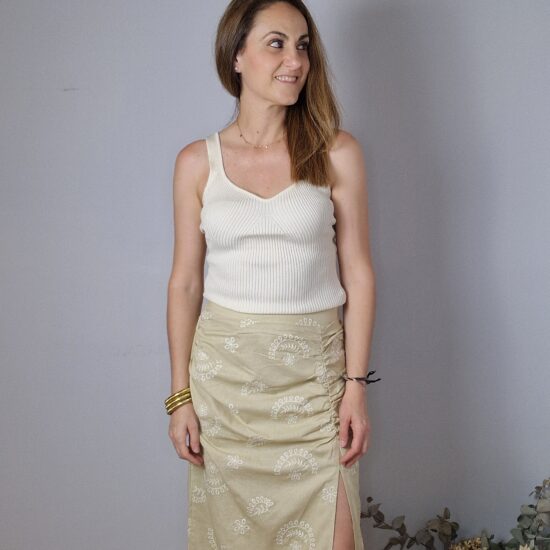 Falda midi bordada, abertura en el lateral,drapeado en la parte superior, goma elástica en la cintura.