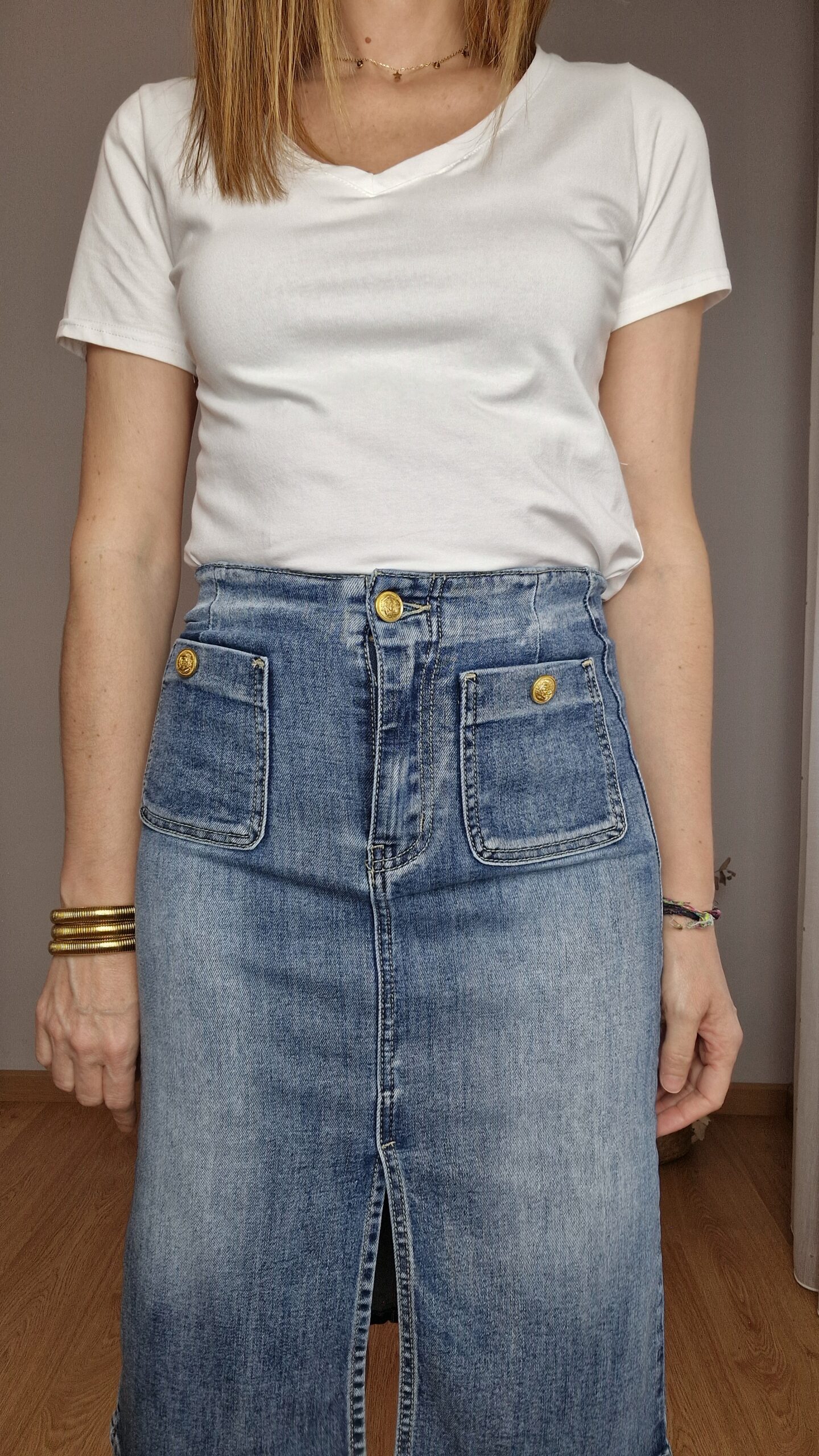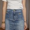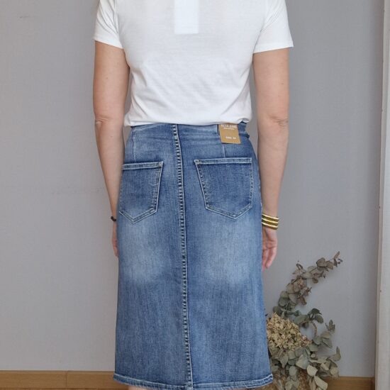 Falda midi denim elástica, bolsillos delanteros , detalle botones dorados, bolsillos traseros, abertura en parte delantera.