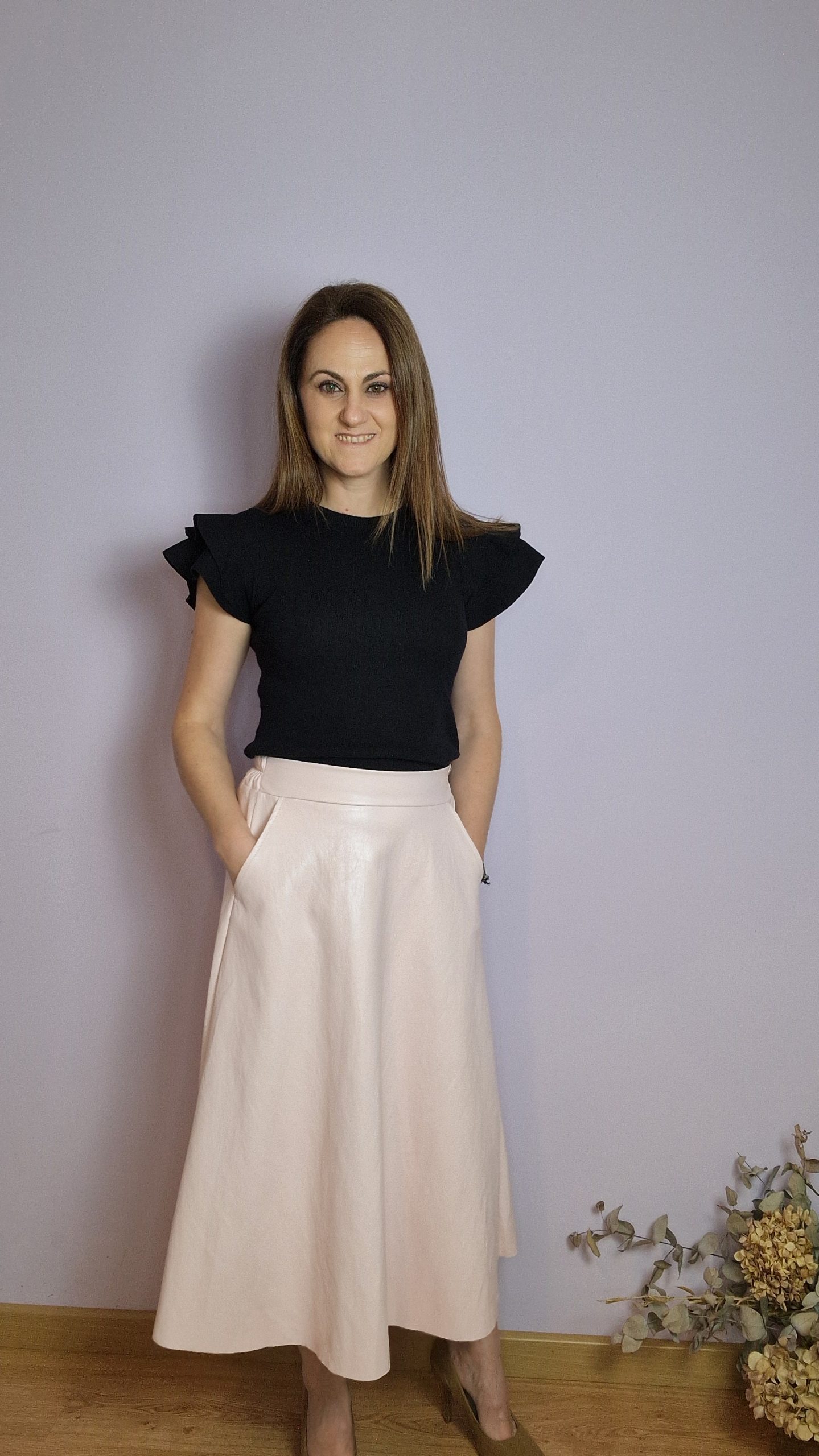 Falda de polipiel confeccionada en un tejido suave y flexible que aporta comodidad y un acabado elegante. Corte midi con caída fluída que estiliza la silueta. La cintura incorpora goma elástica en la parte trasera, lo que permite un ajuste cómodo y adaptable a diferentes tallas. Una prenda versátil y atemporal, perfecta para combinar con prendas básicas o más especiales y crear looks modernos y femeninos.