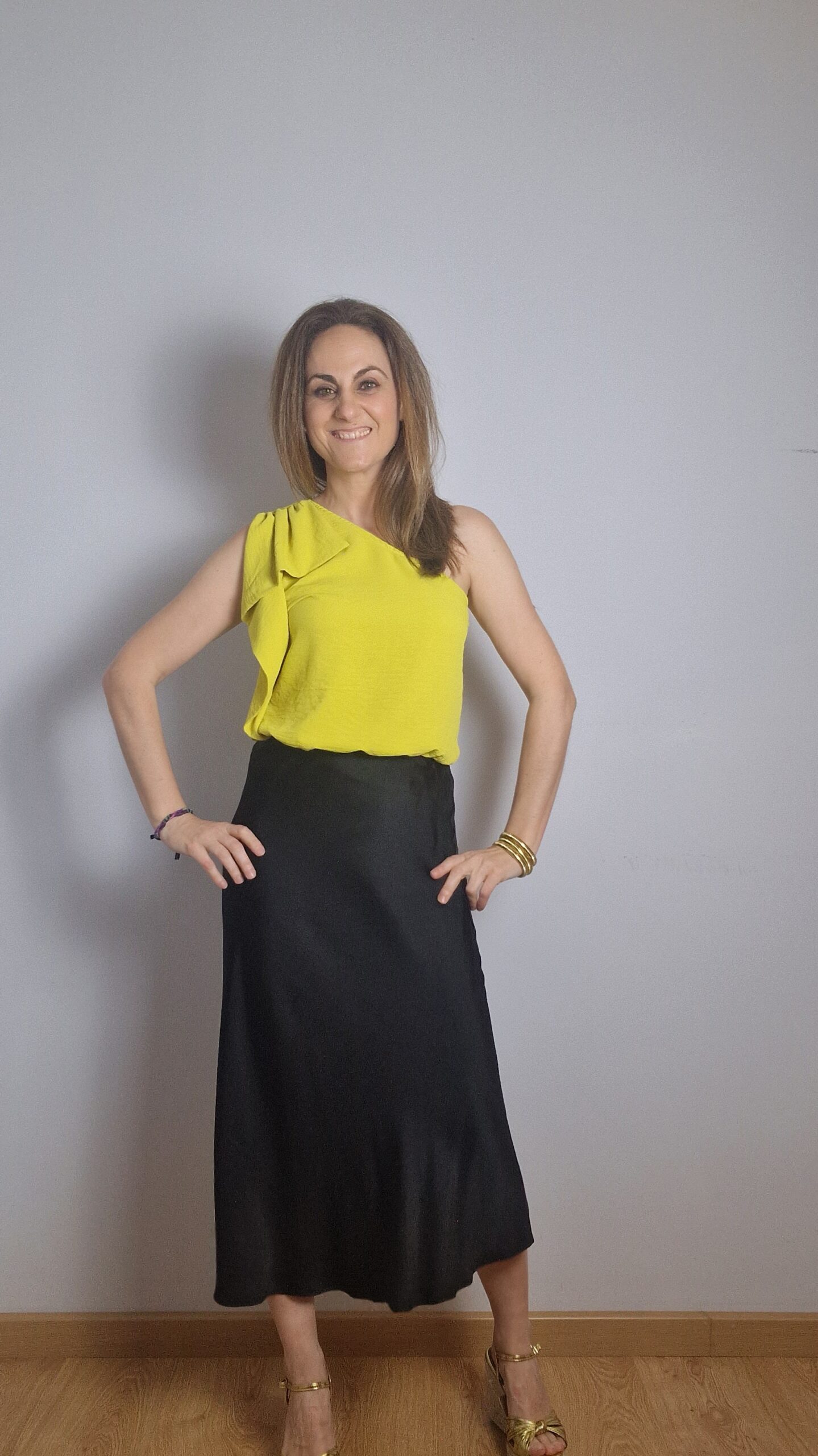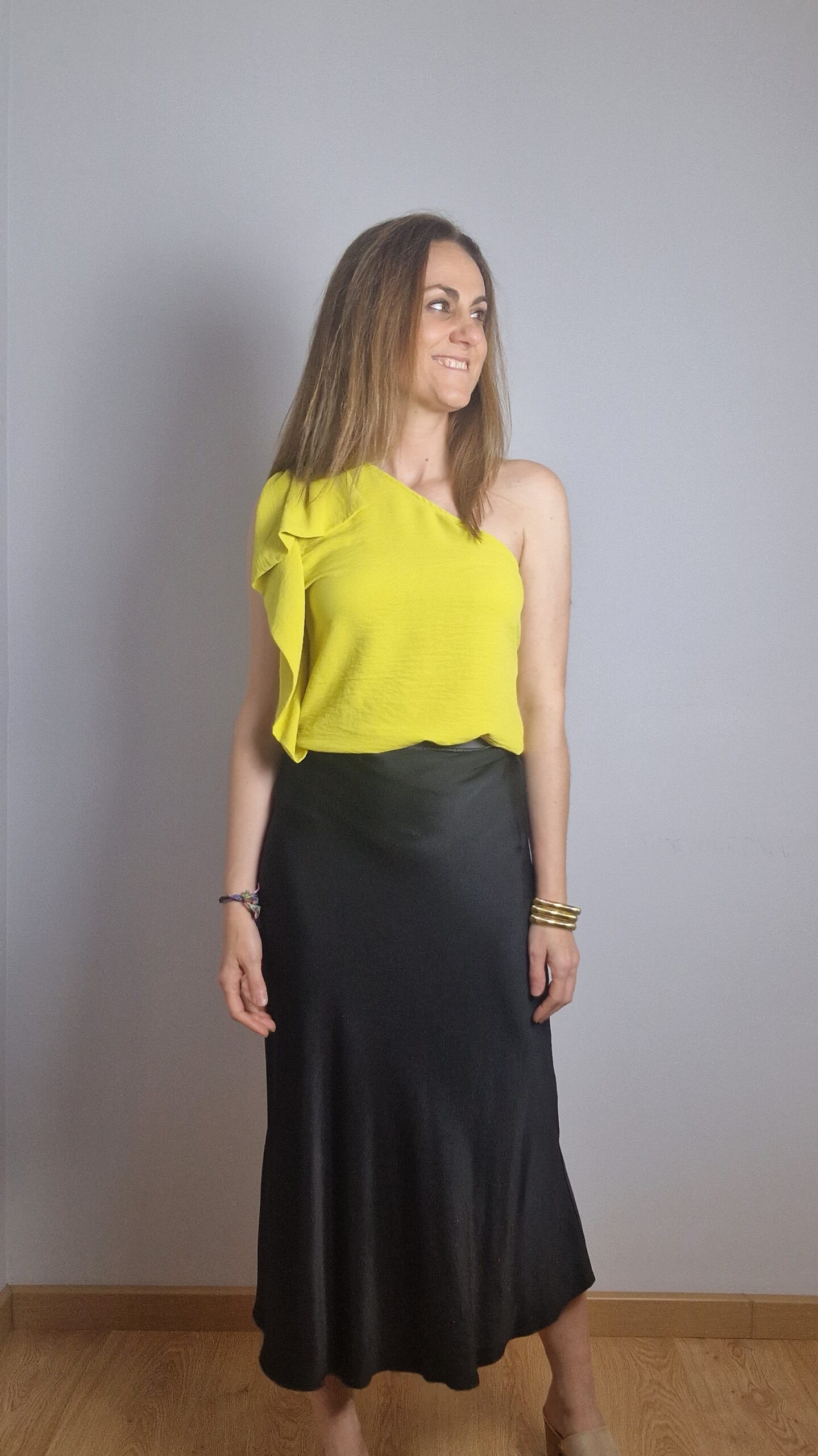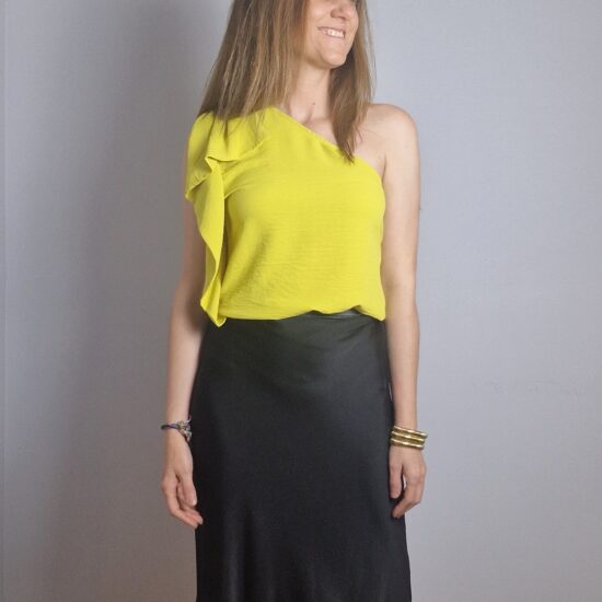 Falda satinada con goma elástica en la cintura .50% de rayón y 50% de viscosa.Largo 80cm