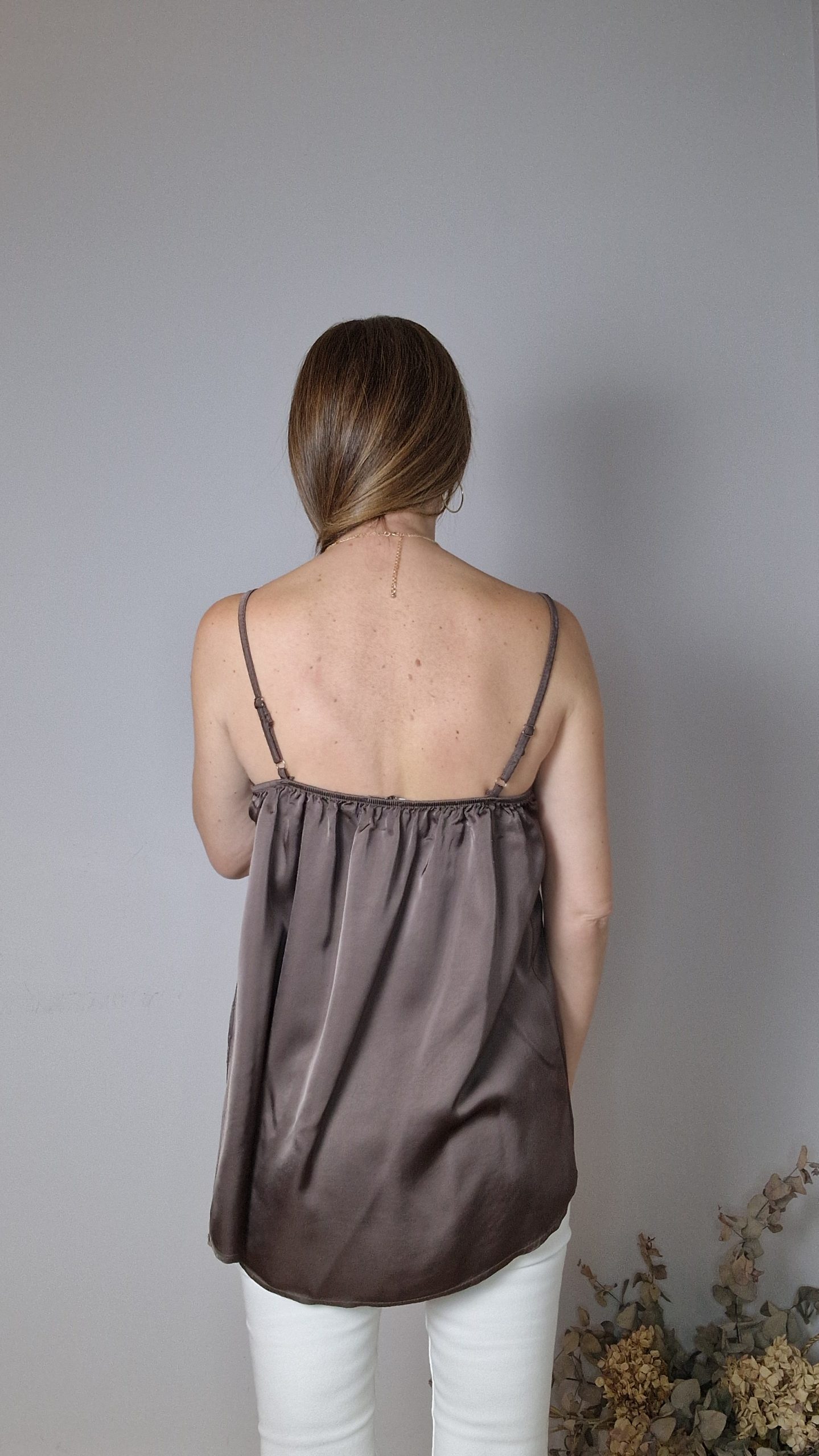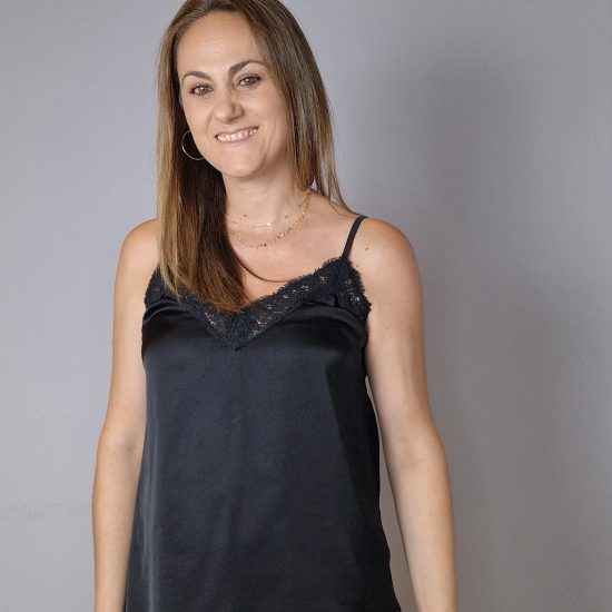 Top lencero, con puntilla en el escote que aporta un aire sofisticado. Tirantes ajustables y goma en la parte posterior  para adaptarse a distintas tallas y mayor comodidad. Ideal para crear looks elegantes o informales. Un fondo de armario imprescindible que se adapta a cualquier temporada.