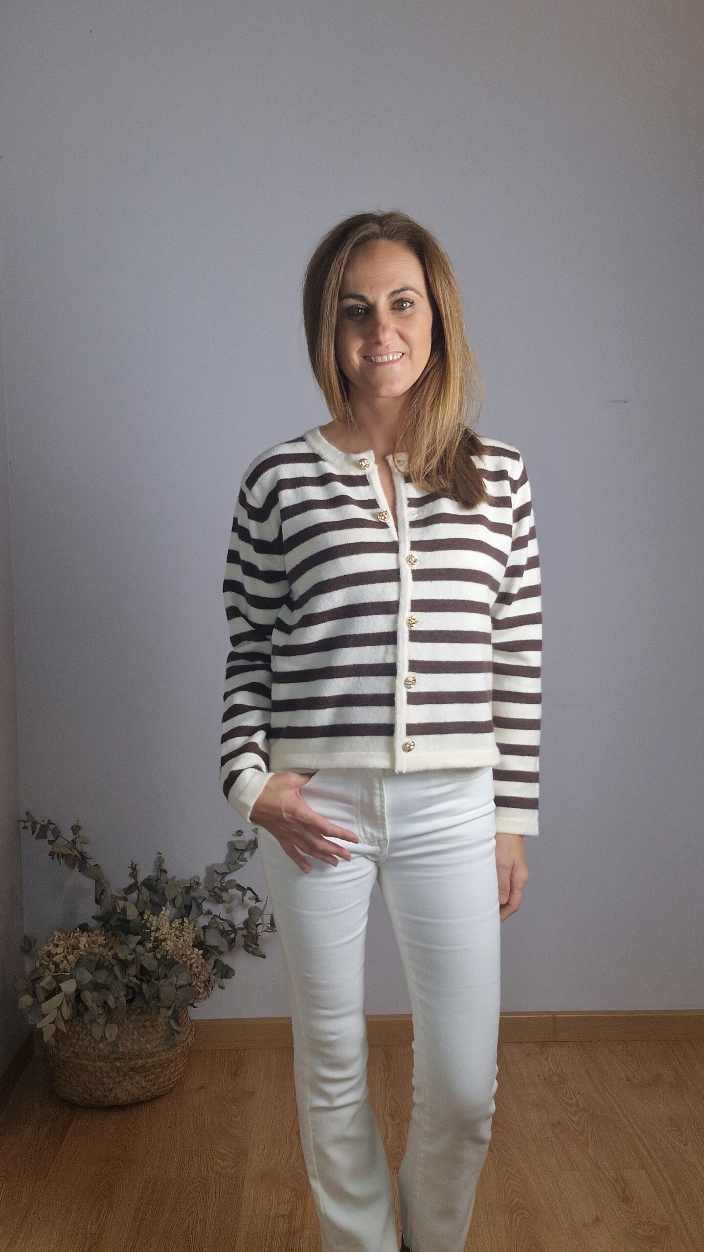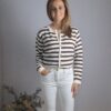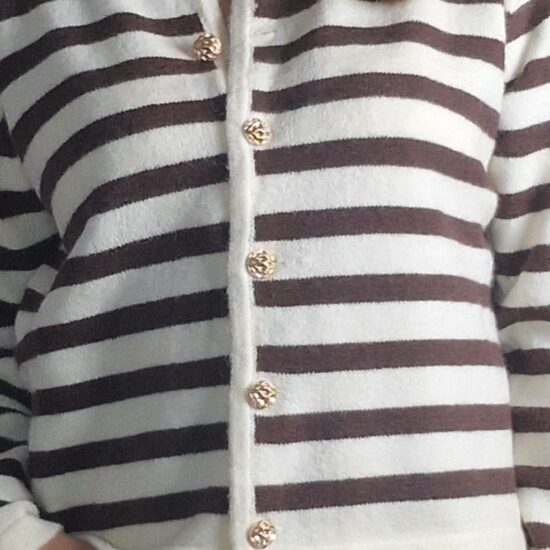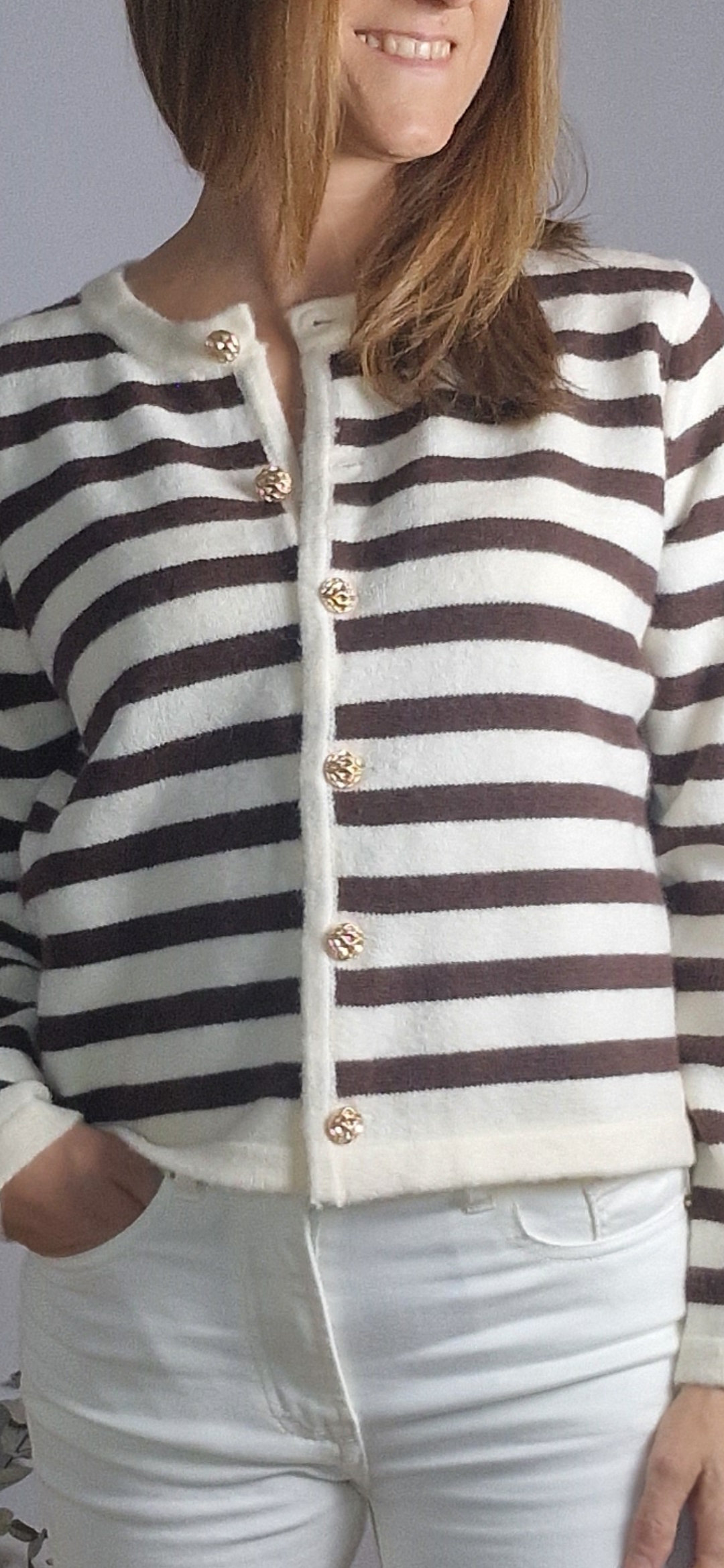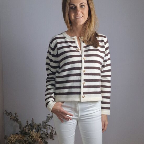 Chaqueta de punto de rayas con cuello redondo y cierre con botones dorados.