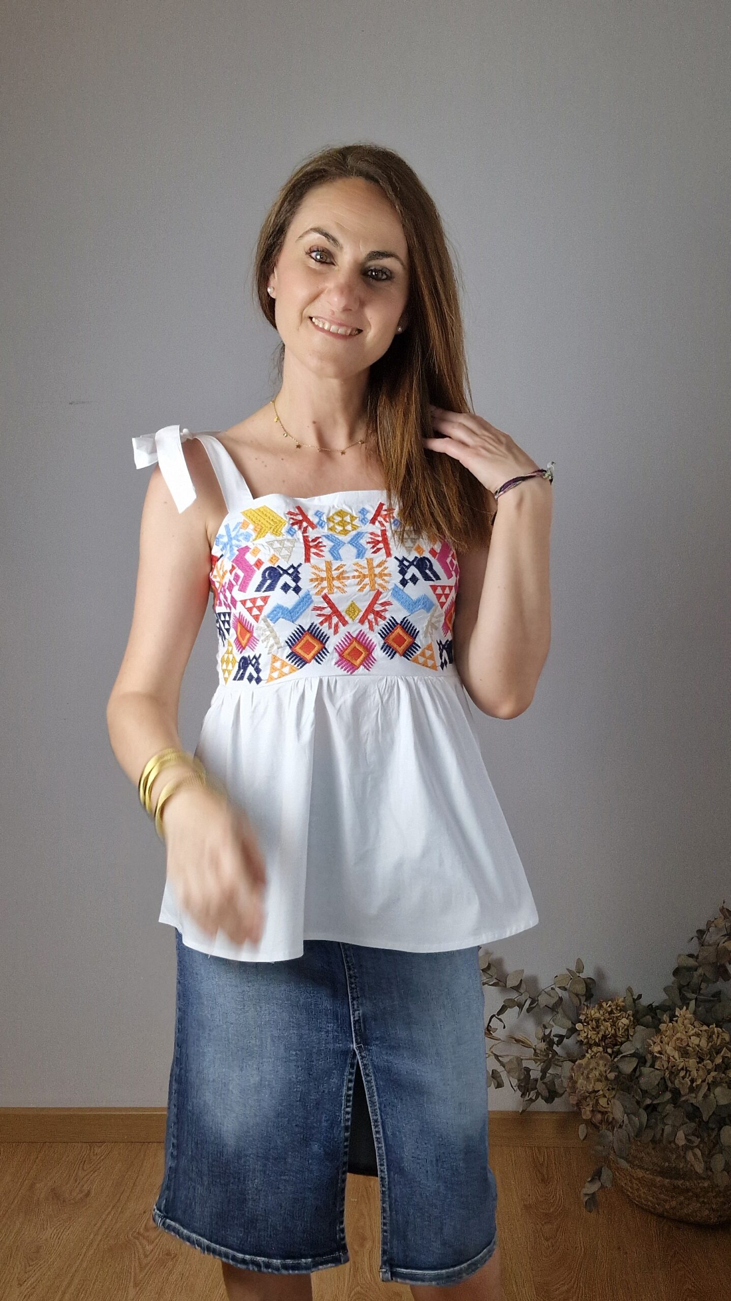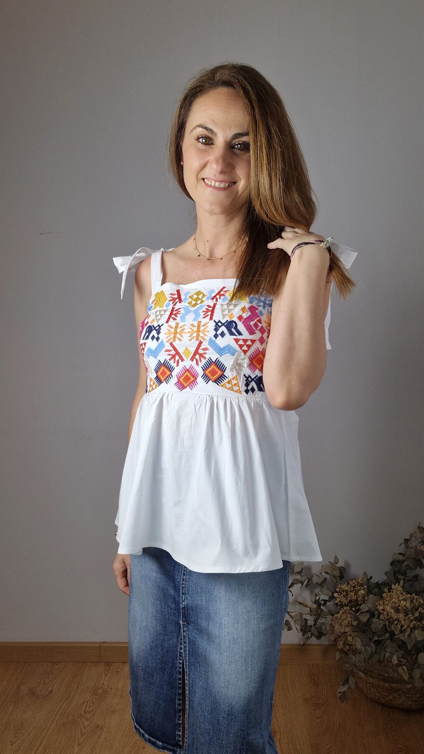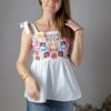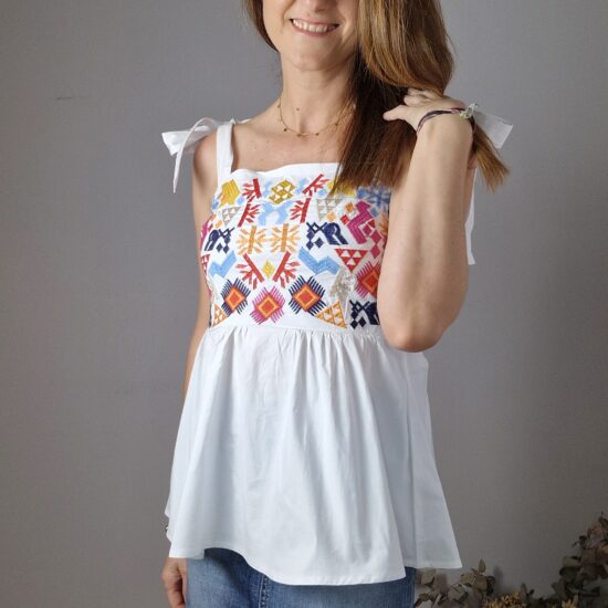 Top con tirante de lazada ajustable, nido de abeja en la parte de atrás y parte de delante con bordados .