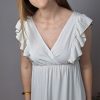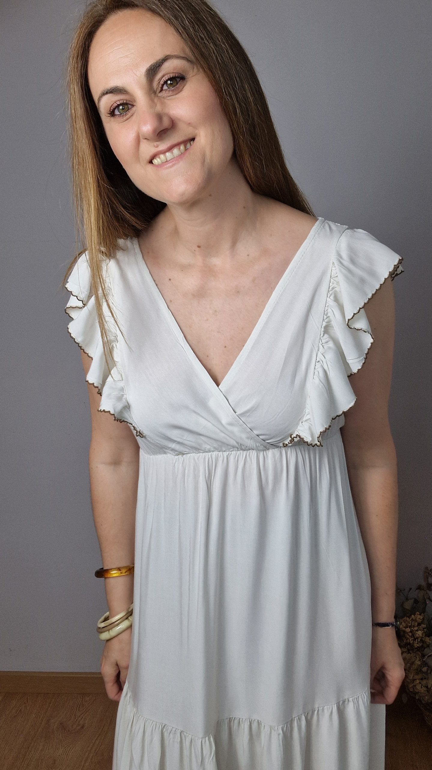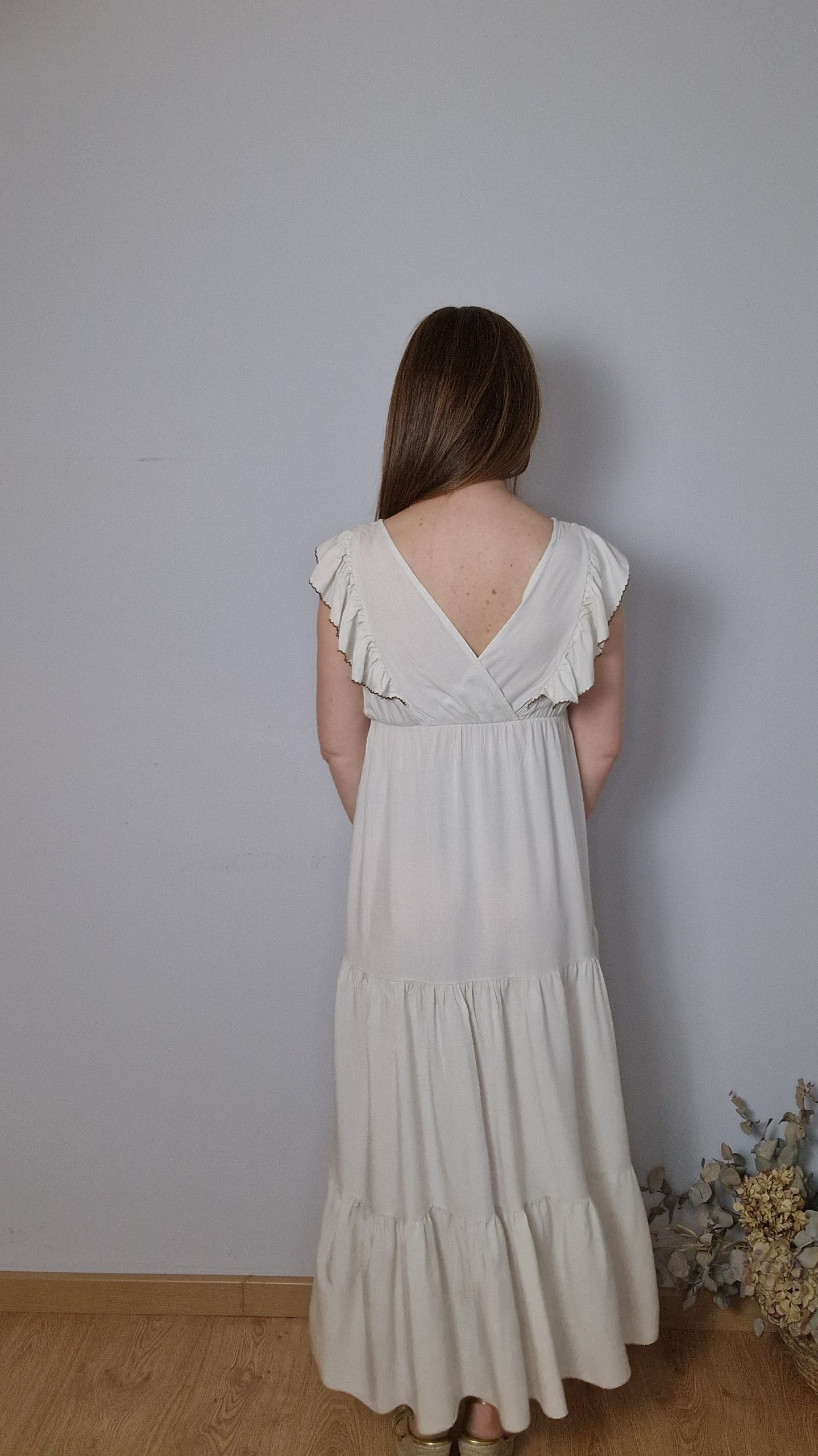 Vestido largo con un diseño elegante y muy favorecedor. Escote cruzado en V con volantes decorativos en el pecho y hombros, corte bajo el pecho que estiliza la silueta y caída fluida con paneles que aportan movimiento.