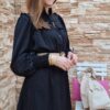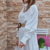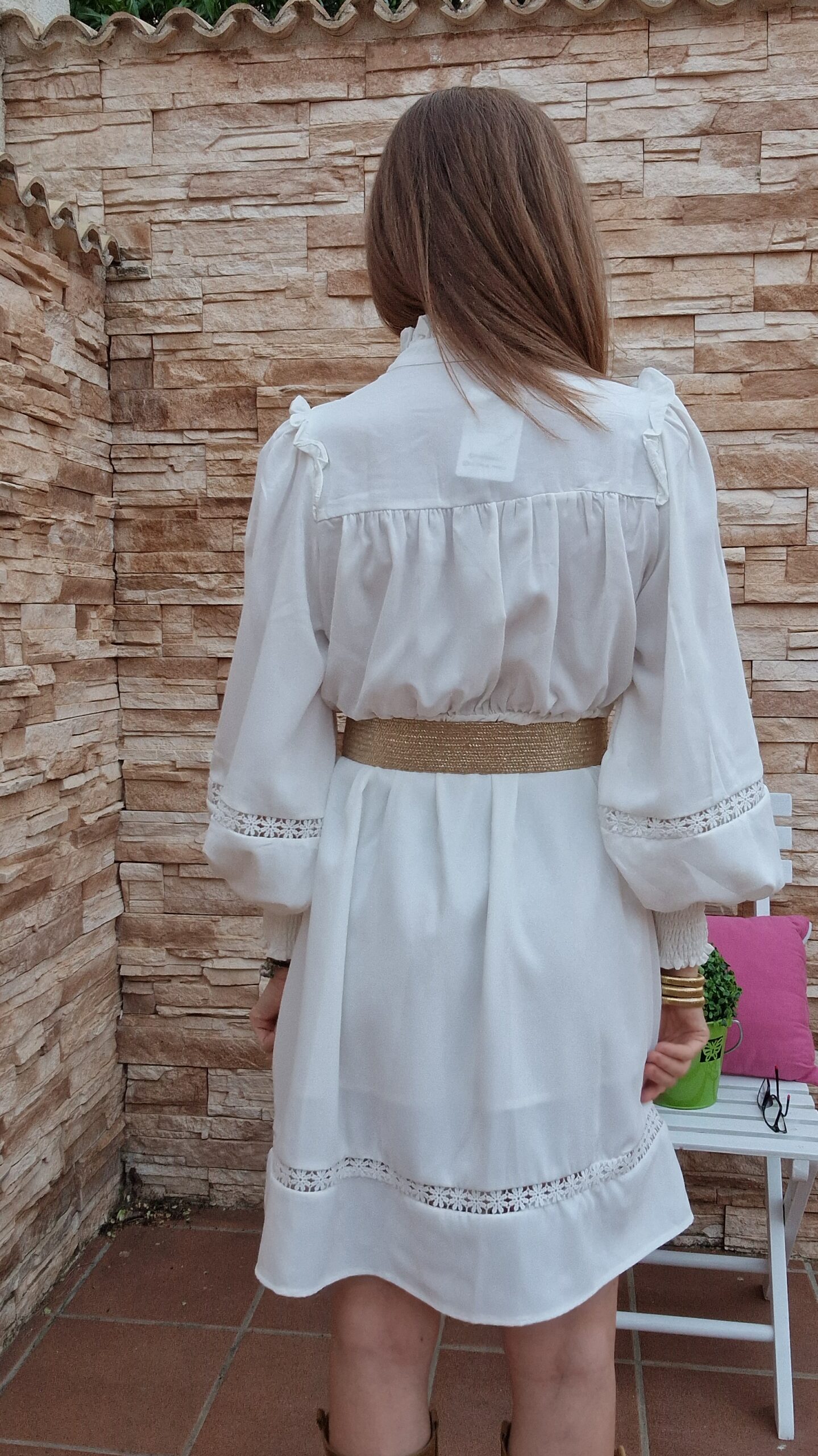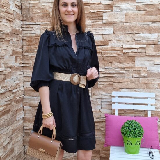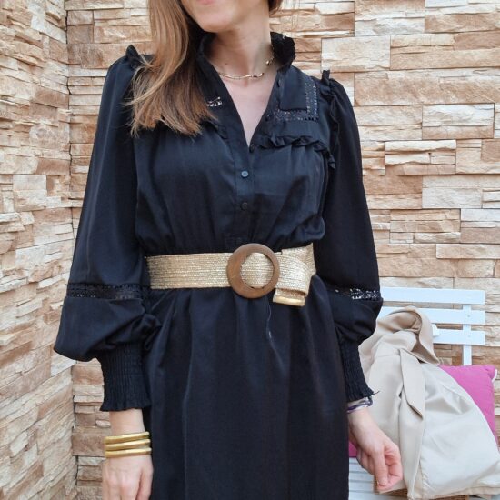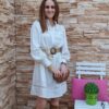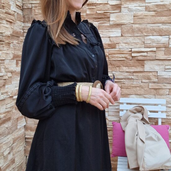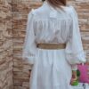Vestido corto de manga larga abullonada .Con puños de goma. Abierto con botones hasta media largura. Cuello mao .Cinturón lazo en la cintura. Lleva forro.