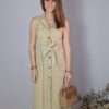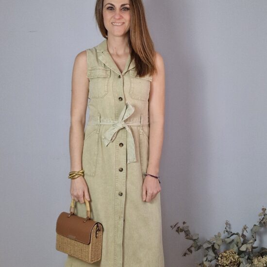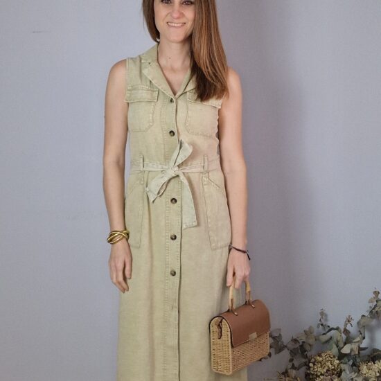 Vestido hombreras, con cierre botones delanteros, bolsillos. Incluye cinturón.
