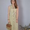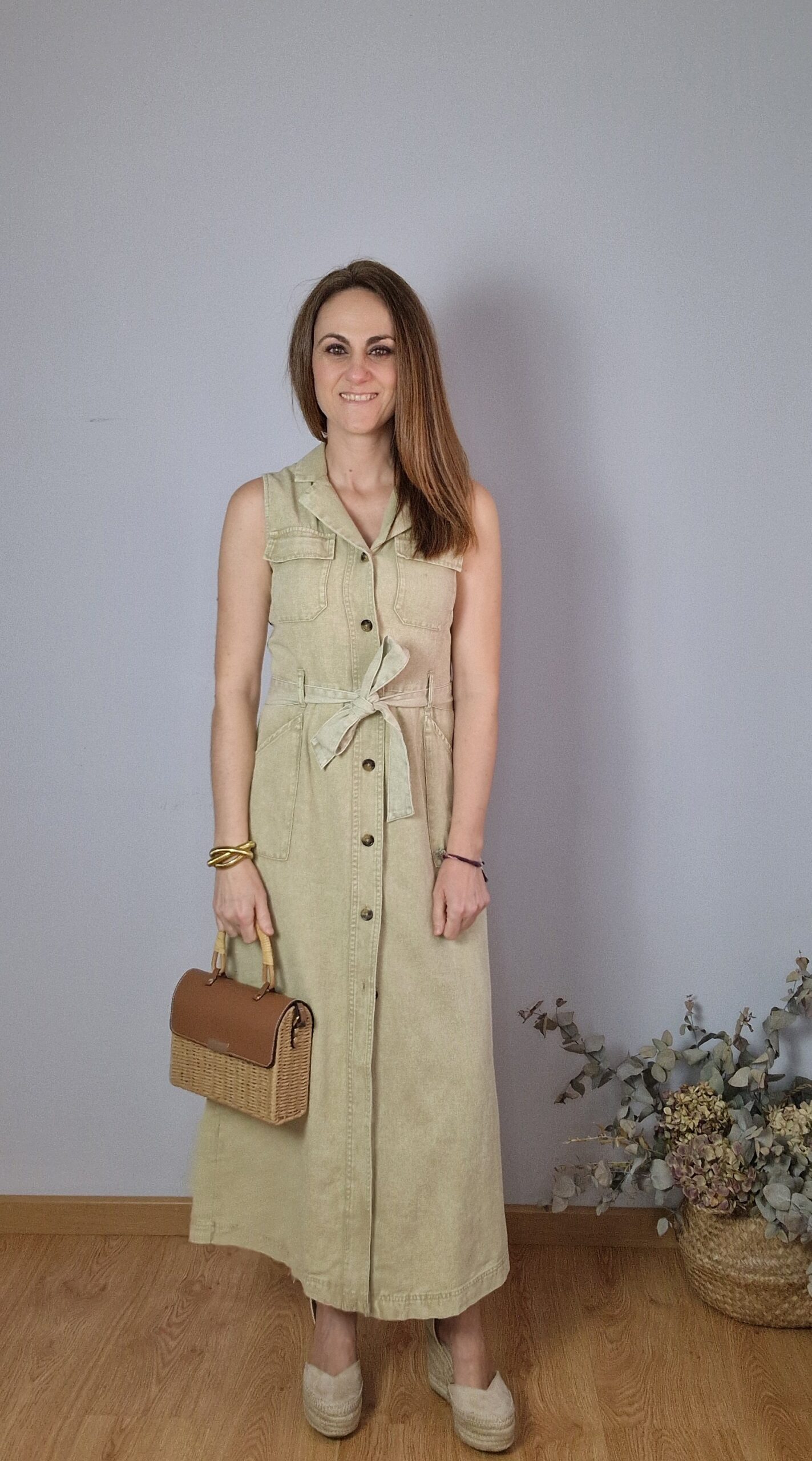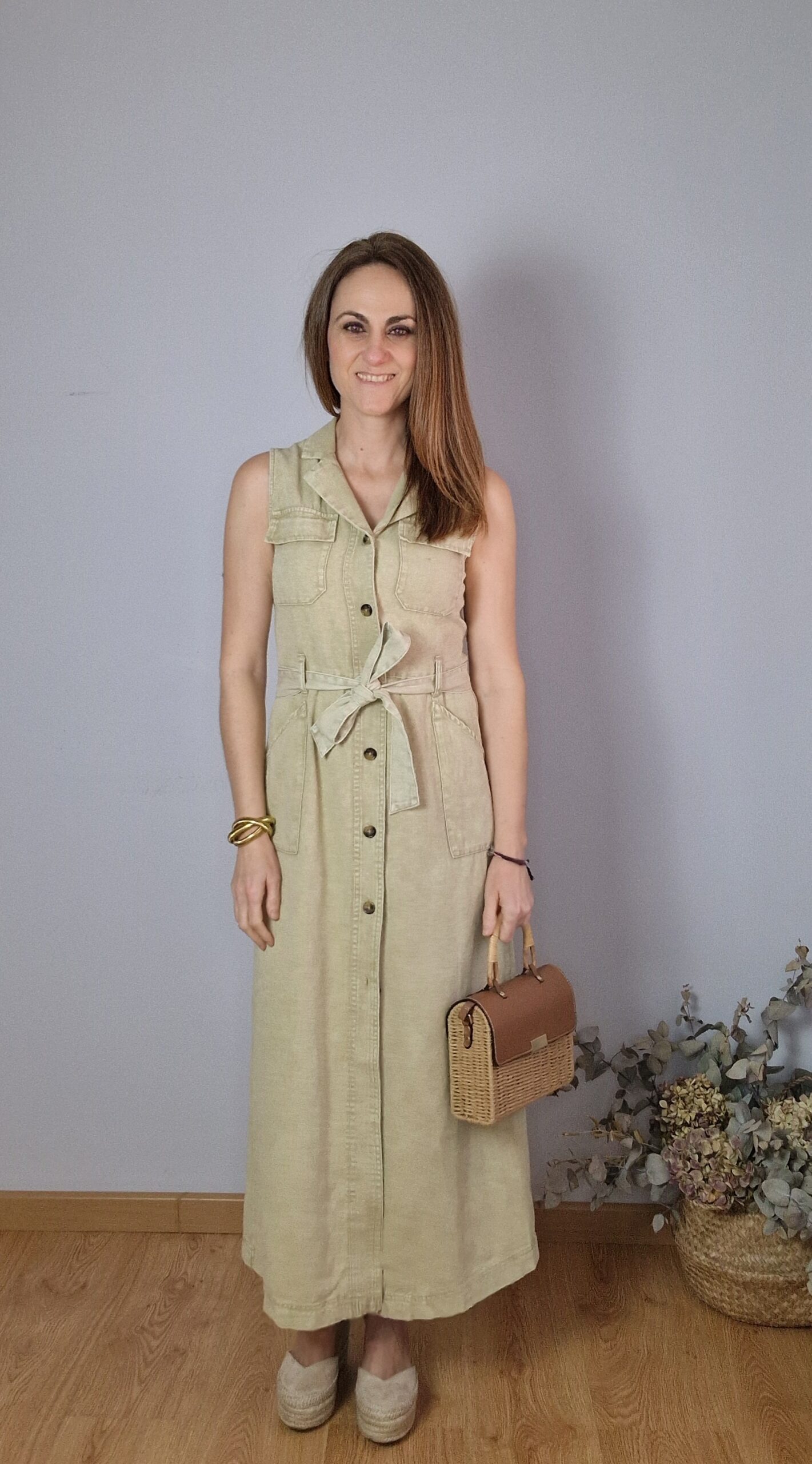 Vestido largo color arena.